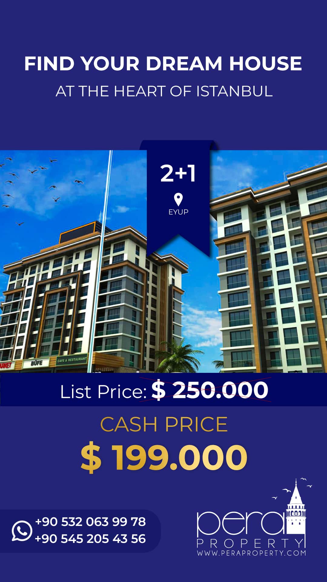 Built on a huge land of 27,000 sqm, this will become a new landmark for the Eyup district of Istanbul. Consisting of 3 blocks, 170 apartments, and 8 commercial units, this will come a low density build with plenty of much needed green space. From 60 sqm to 174 sqm, there are 1-bed, 2-bed, 3-bed and 4-bed apartment options at the project.