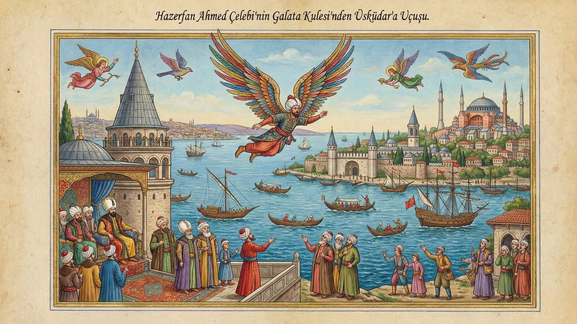 Hezarfen Ahmed Celebi  was an Ottoman aviator, scientist, and inventor from Constantinople (present-day Istanbul), He is one of the first people to fly in history. Hezarfen achieved an unpowered flight with bird-like wings attached to his body between 1623 and 1640. Information regarding his legendary flight was limited in the writings of  Evlia Celebi‘s book “Seyahatname“.